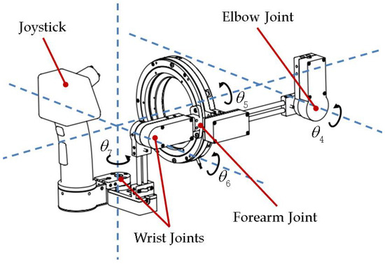 In this research, we designed a compact 3-DOF wrist mechanism as depicted in Figure 12. To align with the pronation/supination rotational axis of the human arm and achieve compactness in the mechanism for measuring the forearm motion, we proposed using a thin-wall rolling bearing with an internal diameter of up to 90 mm to connect the forearm linkage and the wrist mechanism. A 19-bit absolute encoder with a hollow floating shaft (Netzer, DS-130, Misgav, Israel) is installed back to the bearing to measure the pronation/supination motion directly. The 2-DOF serial mechanism for measuring the flexion/extension and abduction/adduction motions of the wrist is installed on the inner ring of the forearm pronation/supination mechanism. The axes of the two DOFs are designed to converge with the forearm rotation axis at the same point, so that the wrist mechanism can work like the spherical joint. A versatile joystick is installed on the end of the wrist mechanism. The wearer’s hands can pass through the forearm rotation ring and hold the joystick. The joint angle values can be read from the absolute encoders installed on the elbow, the forearm, and the wrist mechanism. The values can be directly mapped to the joint angle values in the serial model in Section 2.1.