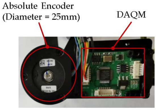 We designed the exoskeleton as a distributed data acquisition system. To obtain an accurate estimation of the wearer’s upper limb pose, the joint angle values should be acquired and synchronously transmitted to the master controller. We developed a low-profile data acquisition module (DAQM) to read encoder data and transmit the values in real time. The DAQMs are installed near the absolute encoders of every joint. The DAQMs access the absolute encoders via the SSI interface and update the joint values at a 10 ms period. A DAQM connected with the absolute encoder is illustrated in Figure 13.