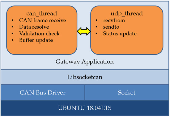 The software stack of the master controller is depicted in Figure 14. The BeagleBone Black runs UBUNTU 18.04LTS OS. We developed the gateway application for transferring data between the CAN interface and the Ethernet interface, which performs data exchange with two independent threads. The user space application obtains access to the CAN controller hardware through an open-source library libsocketcan [38], which provides socket-style API.
