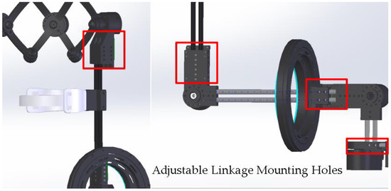 The shoulder joint, elbow joint, and wrist joint are connected with two parallel carbon fiber tubes. To make the exoskeleton flexible to the variant physical size of the wearer, we designed the adjustable linkage mounting holes (Figure 15) on the connection parts. The length of the upper arm, forearm, and palm can be adjusted individually by taking advantage of this mechanism. The total length of the upper limb exoskeleton is adjustable from 460 mm to 540 mm. Empirically, with such an adjustment range, the exoskeleton device can accommodate wearers from 160 cm to 185 cm.