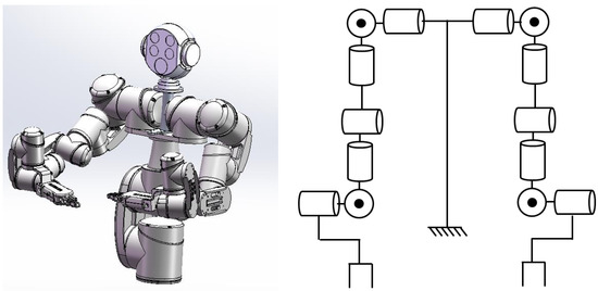 The CAD model and the kinematic structure of the human scale 14-DOF dual arm anthropomorphic manipulator.