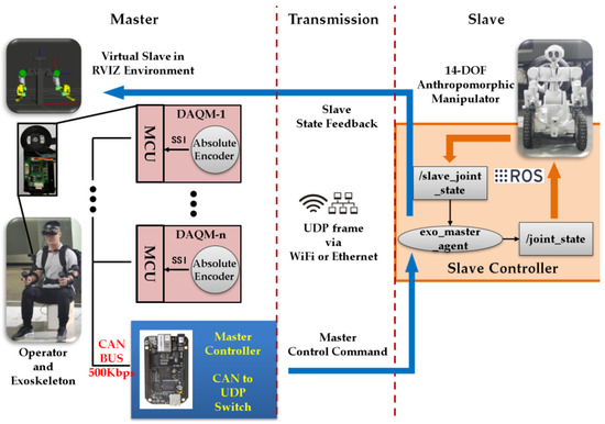The exoskeleton master is connected to the slave robot via Ethernet and sends master control commands as UDP packages every 10 ms. The controller of the slave robot is based on ROS. An ROS node “/exo_master_agent” receives the UDP command packages and maps the master commands to joint space commands for the slave robot and publishes them to the ROS topic “/joint_state” to control the robot. The “/exo_master_agent” also subscribes the topic “/slave_joint_state”, which reflects the real-time state of all the slave joints and sends them to the master side for monitoring. A virtual slave robot can be observed on the master side through RVIZ, which is a 3D visualization tool for ROS.