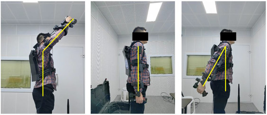 To assess how much the range of motion will be limited by wearing the proposed exoskeleton, the wearer was instructed to perform the seven motions depicted in Figure 2 and try to achieve the maximum range. We took three photos for each motion to record the positive limit, negative limit, and neutral positions. Then the range of motion was measured on the pictures with ImageJ [41]. We also recorded the data for the same subject without wearing the exoskeleton to evaluate the active coverage of the range of motion. Examples of the measurements for shoulder flexion/extension are illustrated in Figure 20. The measurement results are listed in Table 3. It should be noted that this method only provides a preliminary evaluation of the range of motions. So, we use an integer percentage to present coverage of the range of motion.