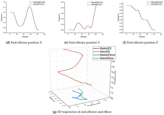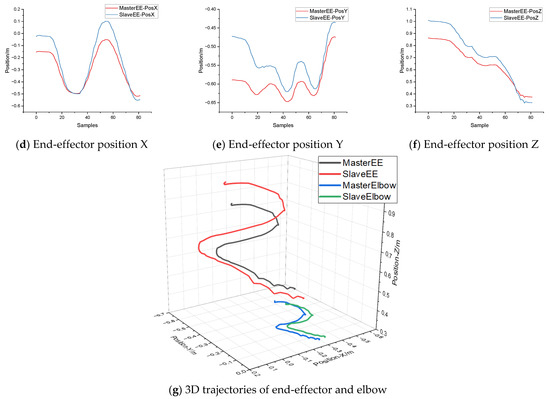 When the joint space control strategy was applied, the end-effector tracking errors between the master and slave of the 6D Cartesian space are illustrated in (a–f) of Figure 21. We found significant tracking errors in the positional dimensions, while the errors vary with position. This is caused by the difference in kinematic parameters (Table 2) between master and slave. Especially for the Y dimension, the maximum error between the master and slave can reach 0.12 m in the test trajectory. Because the gripper of the slave manipulator is much longer than the human hand along the Y axis, the position of the slave end-effector frame will be 0.15 m ahead of that of the master in the initial state. As a result, the position control will be biased by the absolute mechanical difference when moving along the Y axis. This error will be diminished as the end-effector gets close to the frontal plane. This reason also applies to the other two axes. However, the upper limb posture is defined by the relative position of the shoulder, elbow, and wrist. The prerequisite for applying joint space control strategy is similar kinematic structure and arm length ratio (upper arm: forearm) between the manipulator and the human arm. We suppose that the prerequisites could ensure a similar appearance between the master and slave when applying joint space mapping. In our experimental setup, the arm length ratio is 1:1.02 on the master side and 1:1.03 on the slave side. So, from the 3D trajectories depicted in (g) of Figure 21, we found that, although absolute differences always existed between the master and the slave, both the trajectories of the slave end-effector and elbow could maintain good similarity with the master.