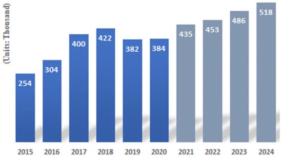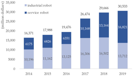 Recently, the robot market is making rapid progress as the fourth industrial revolution technologies, such as artificial intelligence, big data, and 5G combine with robots. As shown in Figure 1, the global robot market is around $30.5 billion in 2019. It will grow at an average annual rate of 32% by 2025. It is projected to grow to $17.2 billion by 2025 [1,2,3,4,5].