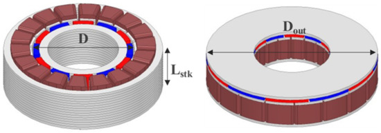 The torque of the RFPM motor is proportional to the square of the motor diameter, as shown in Equation (1). In here, is specific electric loading, is winding coefficient, and is a fundamental of airgap magnetic flux density.
