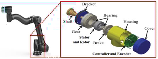 Figure 4 shows the components of the joint robot and the drive module. Currently, RFPM motor for robot joints is mainly used as shown in Figure 5. The motor size has been reduced to a smaller size, and SPMSM’s performance has reached its limit. Therefore, it is necessary to study the high torque of motor for robot joints.