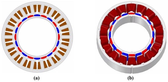 Figure 10a,b shows the shape of the target RFPM motor and the shape of the AFPM motor. The slot area is the area for obtaining the fill factor. The slot areas of the two motors are the same.
