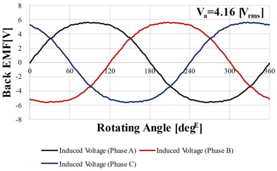 The motor’s back electromotive force (BEMF) and total harmonic distortion (THD) can be identified through a no-load analysis. As the THD decreases, the vibration noise of the motor decreases. The no-load analysis is based on 1000 rpm. Figure 9 shows the BEMF waveform of the target RFPM motor.