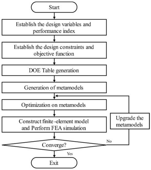 The progressive meta model-based optimal design process is shown in Figure 13. We planned the experiment with minimal experimental points for the initial meta-model configuration. After that, a constraint condition for the performance index and an optimization condition for the objective function are defined. After that, an experiment for meta-model generation is performed to configure the meta-model and a predicted value for the Sequential approximate optimization (SAO) is calculated. The propriety of convergence by an optimization Equation and a restriction condition is determined. If it does not converge, the functional expression of the meta model is changed according to the position of the approximate solution in consideration of the convergence of SAO. Accordingly, a meta model can be created by adding approximate optimal solutions one by one. This is much more efficient than the optimization method based on the existing meta-model.