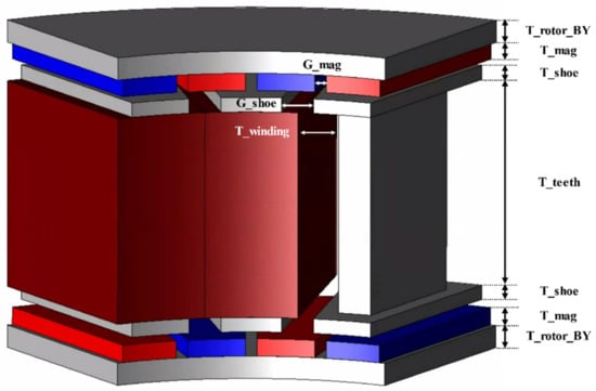 Figure 15 shows the design variables for the 24 pole 18 slot DRAFPM motor. The design variables of the 20 pole 18 slot model are the same. There are a total of eight design variables, including seven real number design variables and an integer design variable (number of turns), shown in Figure 15.