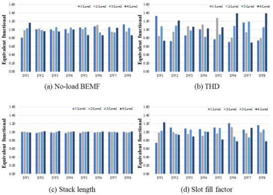 THD is the total harmonic content. A lower THD means that the waveform of the Back electromotive force is closer to the sinusoidal wave. Accordingly, the THD value varies greatly depending on the value of the design variable affecting the rotor and the stator magnetic flux. The height of the stator teeth is less influenced by the level-specific design variables. The reason for this is that Section 5.1 has set the design area of each design variable to an appropriate range to produce the same volume.