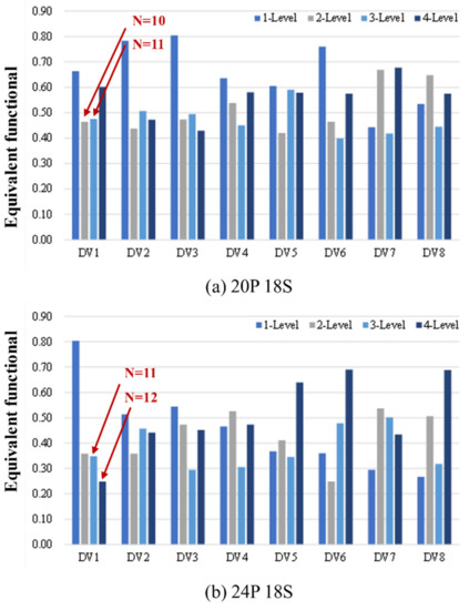 Figure 16 shows the effect analysis results of the 20 pole 18 slot model according to four performance indices. Figure 17 shows the effect analysis results of 24 poles and 18 slots. This shows the effect of each design variable by level.