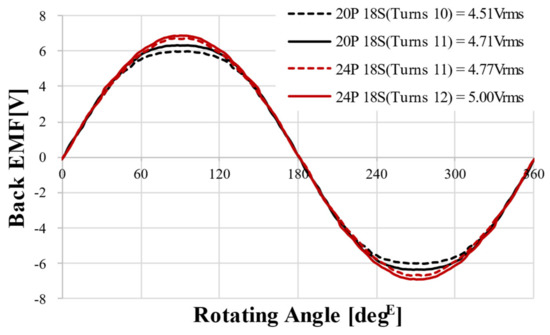 All four designs satisfied the constraints and objective functions. Therefore, considering that the design objective of the no-load BEMF is maximization, the 24 pole 18 slot 12 turns model was selected as the final model.