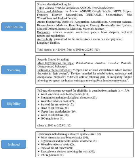 The main keywords for conducting the research were “Human Wrist Bio-mechanics” and “Wrist exoskeletons”. Given the large amount of information available, it was further refined using additional filtering keywords: “Rehabilitation”, “Assistive”, “Wearable”, “Portable”, “Occupational”, “Industrial”. This search identified several hundred candidate papers and these were individually analyzed to detect all technologies implemented on wrist exoskeletons within the areas of: Engineering, Robotics, Automation, Rehabilitation, Computer Science, Bio-mechanics, Medicine, Hand Surgery or Therapy, Human-Machine Systems, Medical Devices, Industrial Medicine, and Materials Science. Using this approach, a set of specific inclusion and exclusion criteria were implemented to further narrow down the literature. These criteria were further applied to the documentation available after pre-screening through the text (e.g., reading the title, abstract or conclusions) and subsequent in-depth reading. This methodology identified documents that included articles, reviews, conference papers, book chapters, technical reports, and regulations.