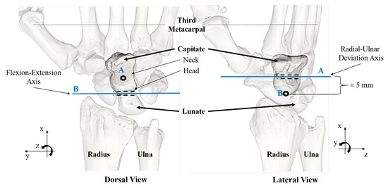 Several in vivo studies have suggested that wrist motions (flexion/extension and radial/ulnar deviation) occur due to movement about two orthogonal and non-intersecting axes in the proximal capitate. These axes have a slight offset of almost 5 mm, as shown in Figure 3.
