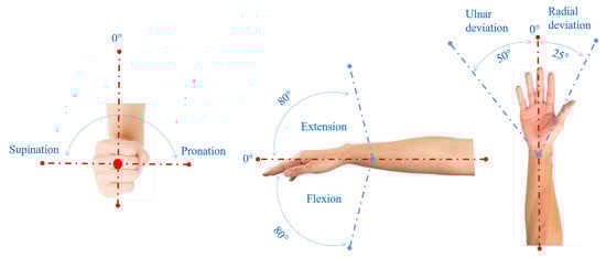 Defining 0° as the neutral position of each movement, it is possible to define the average RoM for each DoF of a healthy human wrist. As shown in Figure 4, flexion and extension are approximately 70°–80°. Radial deviation is around 15°–25°, and ulnar deviation is around 40°–50°, while pronation and supination are between 70° and 85° [18,31,33]. However, it is well known that during activities of daily living (ADL) people never put their wrist to its limits. In fact, when performing daily tasks, wrist RoM is around 15° for flexion, 35° for extension, 15° for radial deviation, and 20° for ulnar deviation [34].