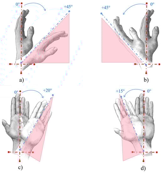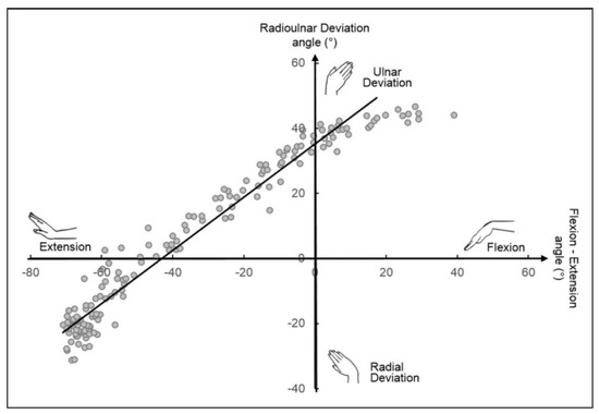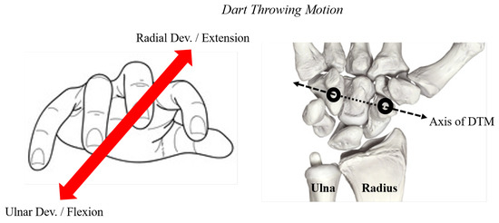 Furthermore, while performing many ADL, motions originating in the carpal bones (flexion/extension and radial/ulnar deviation) are coupled, meaning that one motion limits the other (e.g., radial deviation is reduced when fully extended) [18,31]. In fact, the wrist articulates about an oblique axis defined by the Dart Throwing Motion (DTM) [35,36,37,38]. This movement proceeds from radial deviation-extension to ulnar deviation-flexion, as shown in Figure 5 and Figure 6 [35].