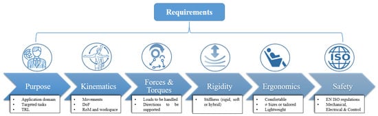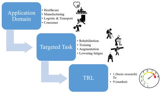 The “purpose” criterion, as shown in Figure 8, refers to the target objective of the device and knowledge of the end users [19]. This is the starting point from which the device design should flow and begins with identification of intended application domain (e.g., healthcare, manufacturing, construction, agriculture, logistics and transport, consumers, etc.). It is important at this early stage that users (companies, hospitals, or research institutes) are fully involved in the design specification to ensure that the designers have a clear focus on real needs and user requirements/expectations. This should be a fully interactive and iterative process that values and prioritizes the input from stakeholders and potential customers on the product feasibility, design proof of concept and choices, and users’ needs and expectations. In parallel with the sector definition and user requirements and expectation assessment, it is vital to identify the targeted condition that the device aims to help (e.g., recovery of motor deficit, assistance during ADL tasks, strength augmentation, lowering fatigue at work, injury prevention, etc.). This entails close study (again involving active interaction with the users) of all details of the tasks (e.g., lifting and transporting loads, maintaining awkward postures or holding a static position, hand screwing or use of tools such as screwdrivers, etc.). It is particularly important to emphasize the key role played by the stakeholders and users who can help to identify critical case studies.