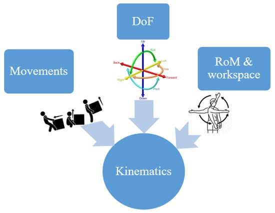 In case of wearable devices, the kinematic compliance deals with the design characteristics a robot should have to comply with the movements, DoF and RoM of a human, as schematised in Figure 9. Often when designing human–robot interfaces there is the tendency to represent human limbs as a serial chain of rigid links linked by joints that can broadly be imitated through knowledge of RoM and DoF. However, as noted when considering the anatomy of the wrist, it is clear that the kinematics of human joints is often much more complex than single DoF or even multiple DoF robot joints. They have more DoF than they need to move in a three dimensional space [12]. So, to be kinematically compliant with the human limb to which exoskeletons are attached, it is necessary to choose a combination of joints and DoFs to achieve a desired task. In particular, every anatomical joint involves a combination of rotational and translational movements since the instantaneous center of rotation (ICR) of human joints is not fixed in a specific position but migrates. Therefore, it has to be taken into account by designing kinematic chains with rotational and translational joints, both active and passive, which can help to compensate for constrained displacements between the device and the human limb. Note that kinematic mismatch could hinder human movement and give rise to discomfort and undesired forces at the human–robot interface [12]. Some tips for the design of exoskeletons, reported in [12], are that the device should be easily worn, suitable for people of different sizes, comfortable, lightweight, should never have more than six DoFs between two consecutive attachments, and does not need to copy exactly the kinematic structure of the human limb.