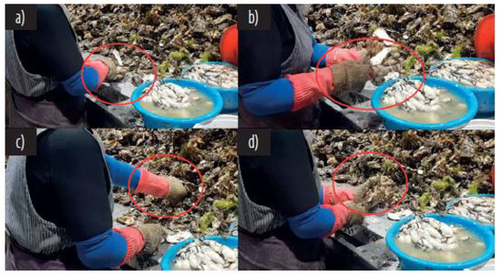 The movement of the hand during oyster shucker’s work. Right hand holding the knife experienced repeated “dart throw motion”: (a) wrist ulnar deviation + flexion; (b) wrist radial deviation + flexion. The other hand holding the oyster experienced repeated: (c) wrist flexion; (d) wrist extension. Reprinted/adapted with permission from J. S. Park et al. [28], published by Nofer Institute of Occupational Medicine, Łódź, Poland, International Journal of Occupational Medicine and Environmental Health, 2021.