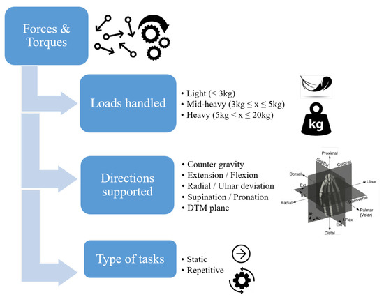 When designing exoskeletons in general, it is important to take into account how much force you need to apply to assist the human limb when performing a certain task, in which directions and with which intensity, as schematised in Figure 11. The same assumptions are also valuable for wrist exoskeletons and depend on the specific activity you should perform. Several researchers have studied this topic [43,46].
