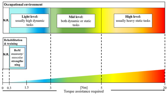 Torque assistance according to applications. Consider applying torque to the center of the rear of the hand, about 0.1 m far from the wrist axis, as done by [54]. Assistance is not required (N.R) if the task requires less than 0.3 Nm of aid, since it is below that required for support a bare hand [39,51,52,56]. In rehabilitation tasks, a torque ranging from 0.3 to 1.5 Nm is common [39,51,52,53]. These are minimum and maximum acceptable values to guarantee movements recovery and muscular strengthening, and they are dependent on the severity level of the impairment. In the occupational sector, where users are considered healthy, possible ranges are wider due to different loads which have to be handled: a light level of assistance is needed for fast, repetitive activities with small loads; a moderate level of assistance is needed for tasks which require torque between 3 and 5 Nm, a range which, according to safety regulations, is the onset point of WRMSDs; a high level of assistance is needed for tasks which require torque above 5 Nm, usually tasks in which heavy loads are managed.