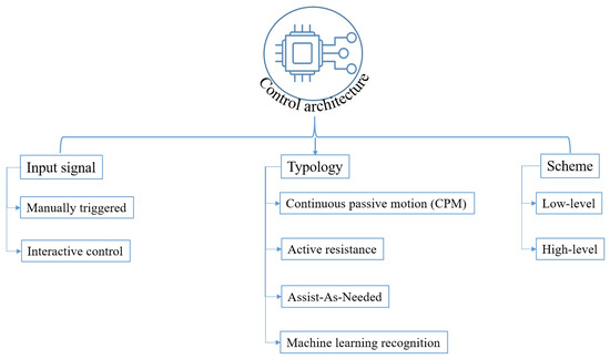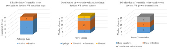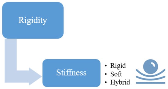 Referring to [19], the rigidity criterion is mainly related to the stiffness of the device and, in particular, the stiffness of the materials of the parts which form the exoskeleton structure and provide the required torques and forces. This characteristic can sub-group robotic devices into rigid, soft, or hybrid, as shown in Figure 13.