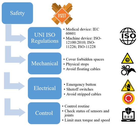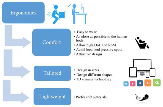 Wearable devices should optimize, where possible, ergonomics, making the device easy to wear, tailored, customizable, lightweight, and safe, as schematised in Figure 14.
