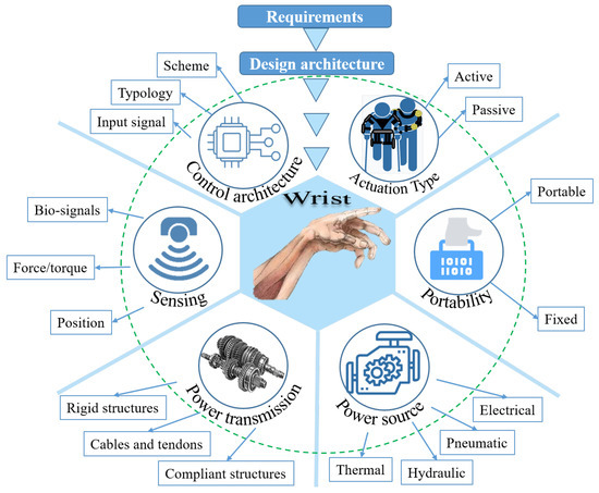 This paper is organized as follows: In Section 2, there is a description of the research methodology in terms of data selection protocol. Section 3 provides an overview of human wrist anatomy and bio-mechanics. In Section 4, the system requirements and issues are defined and described, and this information is used to guide the design of the exoskeleton. Different design architectures are described in Section 5, focusing on actuation type, power source, power transmission, and sensing and control strategies. Finally, in Section 6, a summary of the most significant findings is presented.