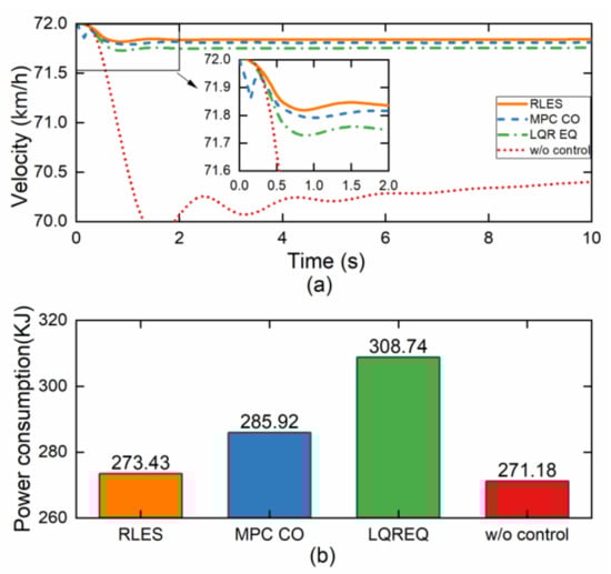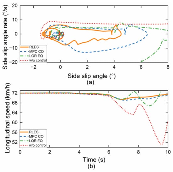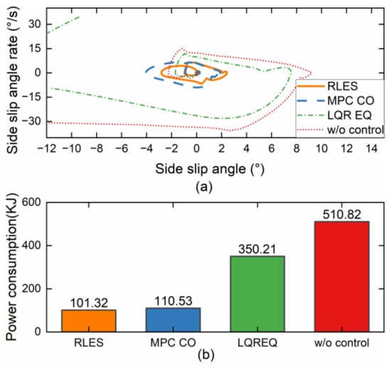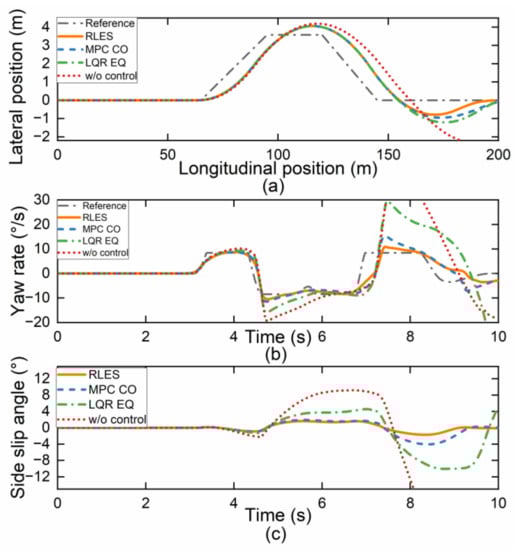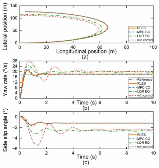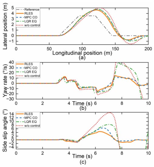 - LQR-EQ. The active safety control layer is the LQR controller in reference [31], and the torque allocation layer is a common average allocation method in Section 3.2.1. This controller considers vehicle safety only.