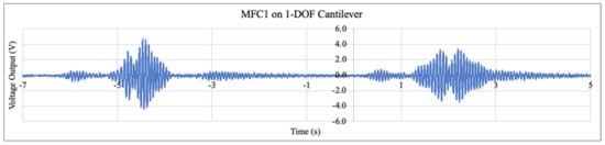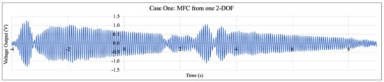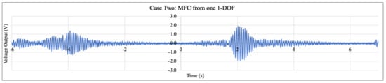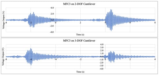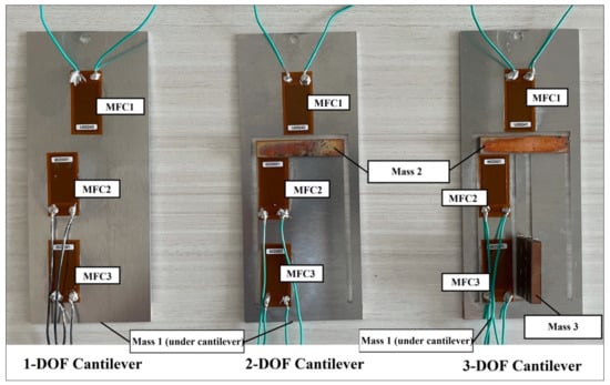 As can be seen from Table 2, the MFCs on the 1-DOF cantilever had only one resonant frequency (at 16.5 Hz), while the MFCs on the 2-DOF and 3-DOF cantilevers had two resonant frequencies (at 11 Hz and 12 Hz) and three resonant frequencies (at 7.1 Hz, 11.4 Hz, and 21.3 Hz), respectively. For voltage peaks captured from these baseline cantilever designs, MFCs on the 1-DOF cantilever generated higher voltage outputs as they were located closer to the support end, while MFCs on the 3-DOF cantilever generated individual peak voltage outputs under corresponding resonant frequencies. This finding reflects that only with the 3-DOF cantilever design all three MFCs made their own significant contributions on energy harvesting under three different vibrational modes. Moreover, a maximum voltage output of 42.2 V was generated from MFC3 on the 3-DOF cantilever, which was higher than the one of 38.2 V from the 1-DOF cantilever, indicating the potential of power outputs from the 3-DOF cantilever higher than those from the 1-DOF cantilever in the same outline dimension.