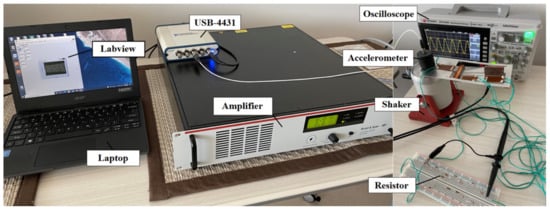 In the laboratory, this study built a shaking system consisting of a permanent magnet shaker, (LDS V201, Brüel and Kjær), an amplifier (LDS LPA100, Brüel and Kjær), a data acquisition system (USB-4431, National Instruments, Austin, USA), an integrated circuit-piezoelectric accelerometer (393B05, PCB Piezotronics, Depew, NY, USA) and a laptop (TravelMate B, Acer, Taipei, Taiwan). The integrated circuit-piezoelectric accelerometer was mounted on the top of the shaker to measure the acceleration of the shaker for controlling purposes. The voltage signal to run the shaking system was generated via one laptop connected to the data acquisition system. Specifically, the signal was first customized via the Labview program with setting frequencies and amplitudes in the laptop. The well-defined signal was then transmitted into one input channel of the USB-4431 to generate a low-voltage output signal and further be amplified by LDS LPA100 to operate the LDS V201 shaker. The USB-4431 was also used to collect the acceleration information from the 393B05 accelerometer via its one input channel. On the other side, the voltage output generated by the piezoelectric patch on the cantilever was measured and recorded by an EDUX1002A oscilloscope with a sampling rate of 1 GSa/s. The entire laboratory setup is shown in Figure 2.