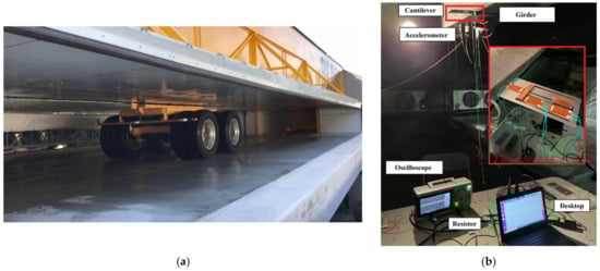 Full-scale test on bridge (a) tandem axle loading on bridge deck; and (b) energy harvesting system with cantilevers attached on a steel girder.