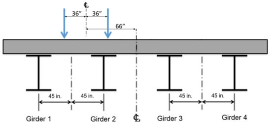 To simulate the real bridge vibration conditions, this study applied a dynamic load of 60 kips moving over a concrete bridge deck supported by steel girders in the BEAST. The specific location of moving load was on the side of Girder 1 and Girder 2, as displayed in Figure 4. For the testing parameters selected in this study, two loading speeds were used, including 6 mph and 12 mph; and three installation locations were selected during the field tests, including 1/2 span of Girder 1 and 1/2 and 1/4 spans of Girder 2.