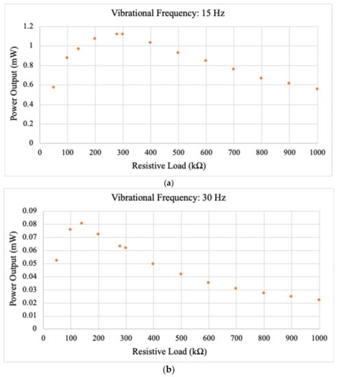 Power outputs under different resistive loads at (a) 15 Hz and (b) 30 Hz.