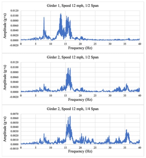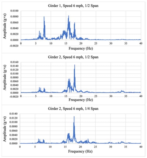 For better observation of the detailed signal components (peak accelerations and corresponding frequencies), the acceleration signals at two different speeds in the frequency domain were further obtained by Fourier transform, as shown in Figure 8 and Figure 9. As can be seen, three significant acceleration peaks were observed on ½ span of girder 1, which were 7.8 Hz, 13.6 Hz, and 16 Hz at 12 mph and 7.8 Hz, 16 Hz, and 18 Hz at 6 mph. For the acceleration peaks observed on girder 2, an acceleration peak at 16 Hz was consistently observed under all scenarios, while another acceleration peak was close to 16.5 Hz at 12 mph and 18 Hz at 6 mph. As the loading speed was increased from 6 mph to 12 mph, the frequency of one vibration mode was sensitively changed from 18 Hz to 16.5 Hz for girder 2 and from 18 Hz to 13.6 Hz for girder 1. The acceleration peaks at different frequencies show that a resonant frequency at 16 Hz can be a general one for the entire BEAST structure since it was consistently captured under any vibration scenarios.