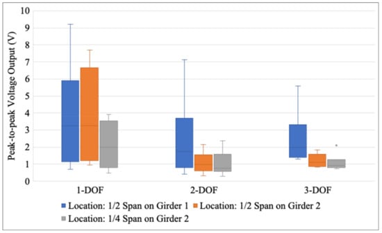 On the other hand, the voltage outputs from 2-DOF and 3-DOF cantilevers at girder 1 were consistently higher than those at girder 2, which meant that the negative effect from the additional peak at girder 1 on energy harvesting performance turned to be insignificant for multiple-DOF cantilevers. This finding indicates the advantages from multiple-DOF cantilever designs under multiple-resonant-frequency scenarios.
