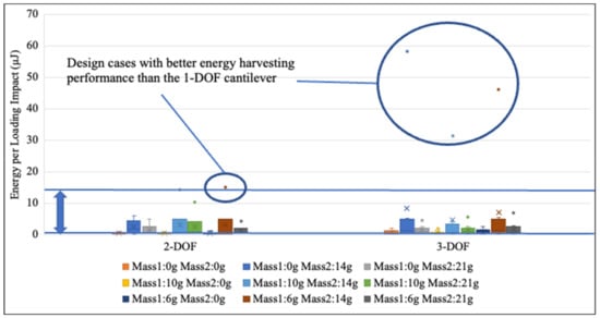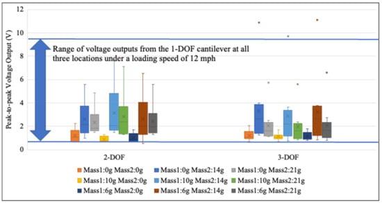 The masses on the cantilever are easy to be changed to improve energy harvesting performance. For exploring the energy harvesting potential of multiple-DOF cantilevers over a single-DOF cantilever, different mass combinations were used on 2-DOF and 3-DOF cantilevers. For unbiased comparison purposes, all cantilevers were in the same outline dimension with a maximum 10 g mass tip on the main beam (Mass 1). Figure 14 shows the voltage outputs from MFCs on 2-DOF and 3-DOF cantilever designs with different mass combinations. For the measurements at each case, the voltage outputs from three MFCs at three installation locations were included. The range of voltage outputs from the 1-DOF cantilever with a mass tip up to 10 g were measured under three locations and used for comparison.