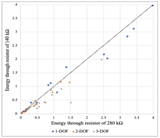 Given that resistive load can directly affect the power output from each MFC under a certain vibrational frequency, the effect of two different resistive loads (140 and 280 ) was evaluated in a full-scale evaluation using baseline cantilever designs under all three locations and two loading speeds. The energies consumed through those resistors are displayed in Figure 16.