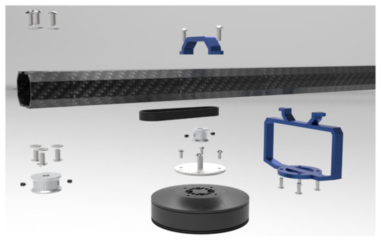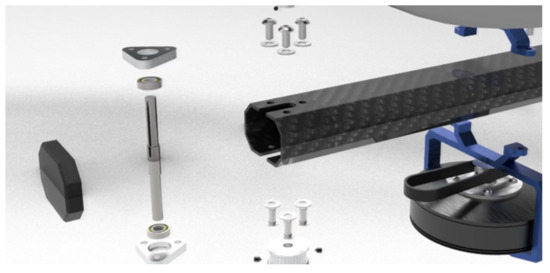 As can be seen in Figure 3, the shaft of each propeller has a larger central section that serves as a shoulder for the positioning of the bearings and their respective supports on both sides. By using the holes in the support, it is possible to mate the shaft to the arm, so that the bearings do not move. The matching between the shaft and the pulley, and the one between the shaft and the propellers, are ensured by two grains.