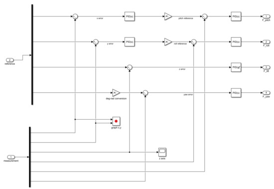 - Budnyaev, V.A.; Filippov, I.F.; Vertegel, V.V.; Dudnikov, S.Y. Simulink-based Quadcopter Control System Model. In Proceedings of the 2020 1st International Conference Problems of Informatics, Electronics, and Radio Engineering (PIERE), Novosibirsk, Russia, 10–11 December 2020; pp. 246–250. [Google Scholar]