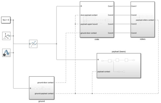 The outer case is made of ABS plastic. Holes on the bottom surface of the case are required for fastening the rollers by supports. A plexiglass door closes the case. Plexiglass reduces friction between the beers and the door, thereby allowing them to slide without stopping. It is also an aesthetic choice because it lets the customer see the beers representing the payload of the delivery drone. The door hinge is equipped with a torsion spring that closes the door once the beers are picked up. To prevent the door from accidentally opening during flight, a linear actuator electronically locks it. This result is checked in a multibody simulation environment described in detail below in the manuscript.
