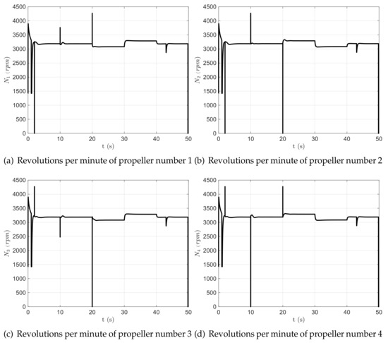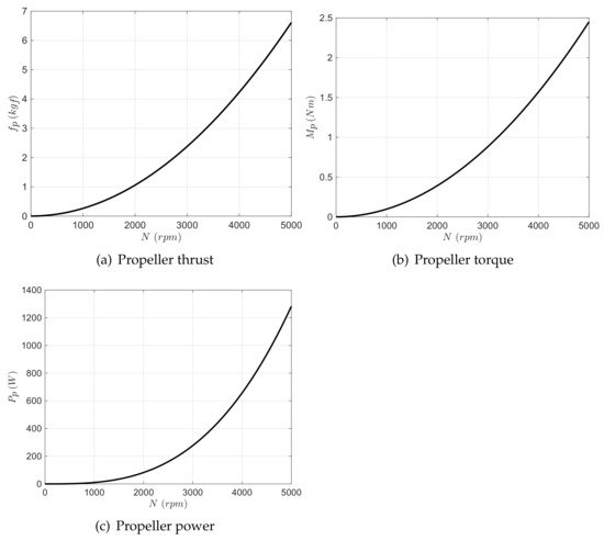 where and are the dimensionless thrust and torque coefficients, respectively, while N denotes the revolutions per minute of the propeller. The parameter represents the air density expressed in (kg/m), which varies with the altitude h expressed in meters according to the following simple law: