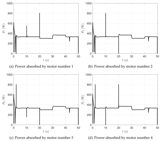 Through an iterative process, based on the analysis of the mathematical models of the propellers, it was possible to choose a combination of propellers and motors that meets the required specifications. The delivery drone to be designed is a quadcopter. Thus, the total thrust required must be divided into four contributions generated by its four propellers. In addition, the motors must meet a thrust-to-weight ratio that is equal to two, which is a common design choice made for delivery drones. In the case of the UAV system designed in this investigation, the total mass is about 10 (kg). Consequently, the thrust force that each motor coupled to the propeller must offer must be more than 5 (kgf). For the reasons mentioned before, the chosen combination of motors and propellers consists of propellers having a diameter equal to 22 (inch) and a pitch equal to (inch), and high-efficiency, low-KV motors with a maximum power output of 1400 (W). In summary, the parameters chosen for the electric motors are shown in Table 1.