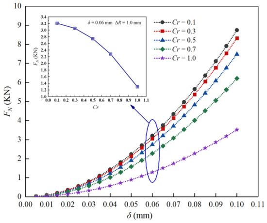 According to Equation (5), the elastic deformation δ, cage clearance , and recovery coefficient are all key parameters affecting the nonlinear stiffness coefficient . Therefore, the influence of three parameters on the normal contact force is studied in this work.