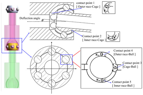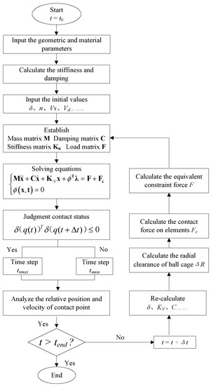 As shown in Figure 5, there are five types of contact points in flexible joints as they are in motion: contact between the outer race and the cage, contact between the inner race and the cage, contact between the cage and the ball, contact between the outer race and the ball, and contact between the inner race and the ball. These contact points are one-point contacts. The multi-body motion characteristics of the flexible joint are studied by analyzing the collision dynamics of five contact points. Figure 6 shows the flowchart of the computational procedure for the dynamic analysis of BCFJ with clearance.