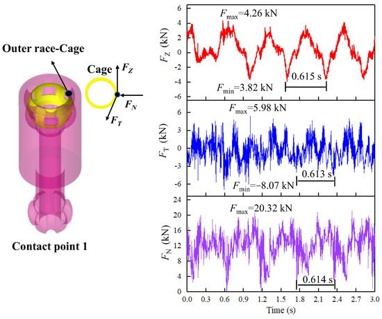 As the flexible joint begins to operate, the arc-shaped inner race of the ball seat collides with the cage, and the contact point changes constantly. The contact forces on the cage are combined into three types: normal contact force (the normal direction of the cage), axial contact force (the axial direction of the cage), and tangential contact (the tangential direction of the cage). Figure 8 shows the variation of contact force between outer race and cage (contact point 1). The periods of contact forces are 0.615 s (), 0.613 s (), and 0.614 s (), respectively. Theoretically, the periods are equal, but there is a maximum error of 0.002 s due to the influence of the calculation error. The frequency of the collision force is 1.63 Hz, which is consistent with the input rotation frequency. The peak value of normal contact force is 20.32 kN, which is the maximum value of the three.