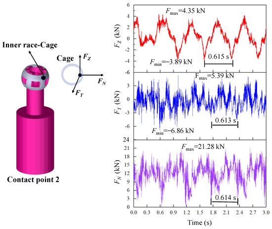 Figure 9 shows the variation of contact force between inner race and cage (contact point 2). Comparing the result with that in Figure 8, we can obtain that the variation cycle and trend of contact forces are similar, and this is because the shape of outer race (ball seat) and inner race (ball head) is the same. Furthermore, due to the influence of the cage clearance, there is a 0.22 s time difference between the collision time of contact point 1 and contact point 2. The contact forces of contact point 2 are still dominated by the normal contact force, and the maximum value is 21.28 kN.