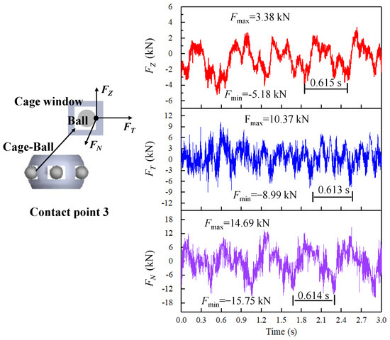 Figure 10 shows the variation of contact force between cage and ball (contact point 3). During the rotation, six ball keys are in contact with the inside and outside of the cage window, so the normal contact force fluctuates between positive and negative values (from −15.75 kN to 14.69 kN). Without considering gravity, in order to make sure that the cage can keep oscillating at the equilibrium position under different rotation angles, the cage should meet the equilibrium condition under the action of contact forces. To verify that, the contact force of contact points on the cage are analyzed at the time t = 1.51 s, and the results are listed in Table 3. It can be seen from the table that the ball cage satisfies the equilibrium condition in three directions, which verifies the reliability of the calculation model.